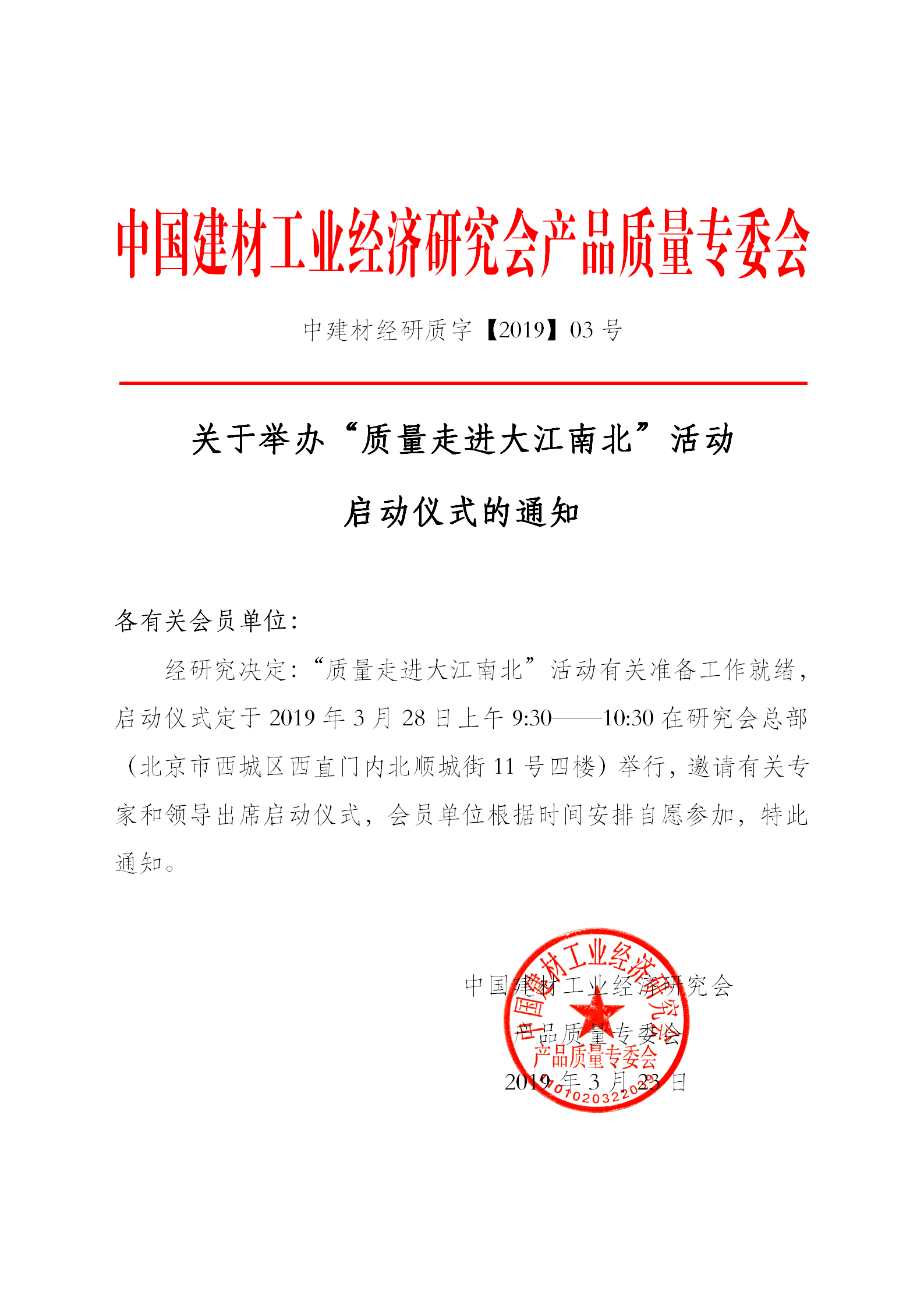 “質量走進大江南北”是中國建材工業經濟研究會產品質量專委會信息傳媒部一項公益性欄目,“質量走進大江南北”啟動儀式將于2019年3月28日上午在研究會總部舉行。委托理事單位京港視通傳媒(北京)有限公司(簡稱“京港視通”)作為“質量走進大江南北”欄目的運營單位。通過對會員單位、業務主管單位及有關單位的實地走訪和信息調研,打造專注建材行業產品質量提升的宣傳欄目。主要以建筑建材行業的優質企業(產品)為欄目推廣對象,實地采訪形式宣傳、推廣企業及產品的品牌形象,提高企業知名度,擴大企業在行業的影響力,追溯企業的先進管理思路和經營理念,為同行或企業界提供啟示,為行業樹立標桿,從而達到弘揚高質量發展、傳播行業正能量發展,逐步提升整個建材行業產品質量的目的。