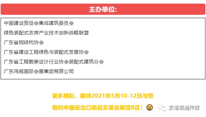為了推進(jìn)裝配式建筑領(lǐng)域的廣泛合作,助力粵港澳大灣區(qū)建設(shè),由中國(guó)建設(shè)貿(mào)促會(huì)集成建筑委員會(huì)、綠色裝配式農(nóng)房產(chǎn)業(yè)技術(shù)創(chuàng)新戰(zhàn)略聯(lián)盟、廣東省鋼結(jié)構(gòu)協(xié)會(huì)、廣東省建設(shè)工程綠色與裝配式發(fā)展協(xié)會(huì)、廣東省工程勘察設(shè)計(jì)行業(yè)協(xié)會(huì)裝配式建筑分會(huì)、廣東鴻威國(guó)際會(huì)展集團(tuán)有限公司等聯(lián)合主辦的,將于5月10-12日在中國(guó)進(jìn)出口商品交易會(huì)展館B區(qū)11.1-10.1號(hào)館隆重舉辦,本屆吸引了近300家優(yōu)質(zhì)工程總承包供應(yīng)鏈企業(yè)展示先進(jìn)技術(shù)和產(chǎn)品,覆蓋裝配式建筑開發(fā)建設(shè)、設(shè)計(jì)施工、集成房屋、部品部件、裝配式裝修、裝備制造等產(chǎn)業(yè)鏈上下游全領(lǐng)域。