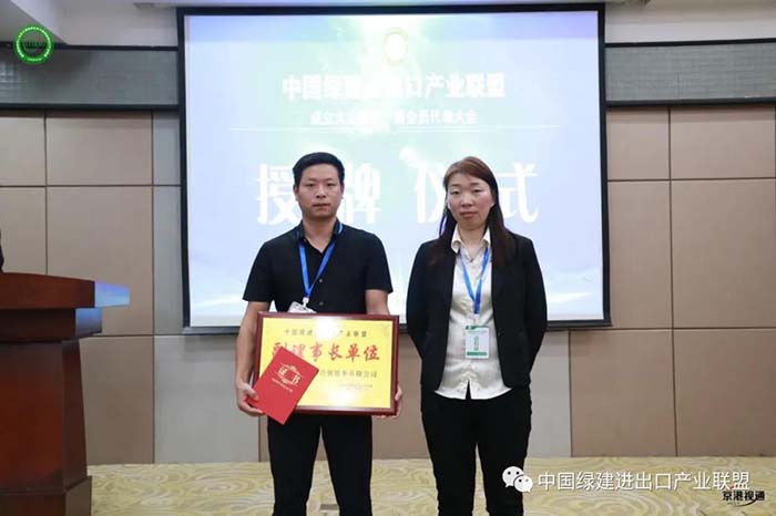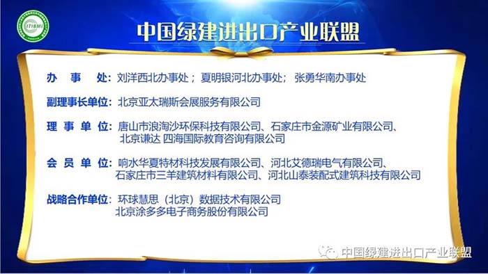 郭理事長講到:在國際市場,歐美等發達國家和地區是世界建筑材料的主要消費市場,該市場的消費量約占世界總消費量的70%以上。而且這些國家的“綠色消費”的消費總量逐年提高,綠色建筑材料的國際市場需求不斷增長,國內外綠建市場呈蓬勃發展之勢。中國綠建進出口產業聯盟的成立后將充分發揮聯盟的紐帶和橋梁作用,服務好會員企業,為綠建行業的健康快速發展貢獻力量。