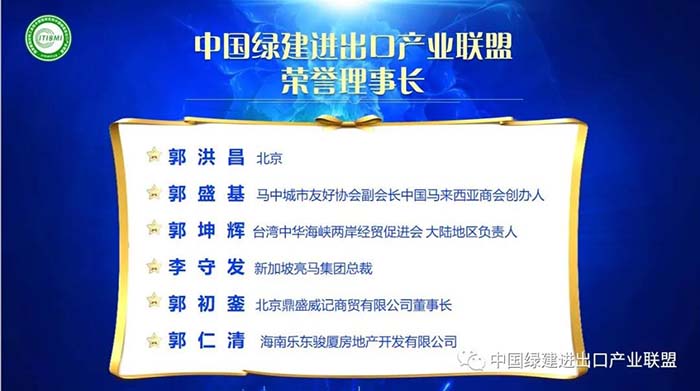 國家建筑材料工業技術情報研究所、首席專家 崔源聲主席、國家建筑材料工業技術情報研究所副所長薛艷峰、主任田桂萍、中國綠建進出口產業聯盟理事長候選人郭朝連、來自北京的領導郭洪昌、馬來西亞中國商會副會長、馬中友好協會郭盛基會長、臺灣中華海峽兩岸經貿促進會、大陸地區負責人郭坤輝先生、清華大學建筑設計研究院張以超教授、新加坡亮馬集團總裁李守發、北京鼎盛威記商貿有限公司董事長郭初鑾、海南樂東駿廈房地產開發有限公司董事長郭仁清、河北智博保溫材料制造有限公司總經理布立坤、環球慧思(北京)信息技術有限公司大區總監高健、國聯股份涂多多副總裁邵召軍、北京建工華創科技發展有限公司特邀顧問宋傳貴、中國綠建進出口產業聯盟副理事長候選人古麗、中國建材頻道京港視通在線部長田品、北京亞太瑞斯會展服務有限公司總經理楊紅江、華藝建材科技有限公司總工程師謝思松、河北山泰裝配式建筑科技有限公司總經理王繼龍等專家與企業代表。